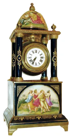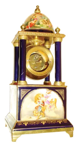 Germany, extremely decorative porcelain and gilt bronze table clock, the portico style case on a square porcelain base with finely painted polychrome enamel panels, depicting figures in classical dress engaged in various activities, cobalt blue columns