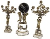 France, 3-piece mantel set, "3-Cherubs" supporting a star studded ball containing the movement, time indicated by "arrow" hands, all 3 with bases of white marble, and ormolu swag accents, and each candle stand with rose cups for 5 candles, and with