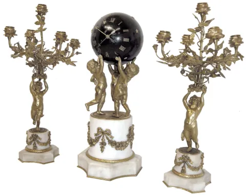 France, 3-piece mantel set, "3-Cherubs" supporting a star studded ball containing the movement, time indicated by "arrow" hands, all 3 with bases of white marble, and ormolu swag accents, and each candle stand with rose cups for 5 candles, and with cylinder platform, bell strike movement intact, C.1880 this clock was shipped to us from Europe, and one of the threaded studs from a cherub's hand through the ball has come out, and is taped inside the globe. The movement seems to run and strike OK; we replaced the hand pin so the hands would not get lost, you can fit a better hand washer. Movement access is via a threaded portion of the globe in rear. Note if we ship this a long distance, we will dis-assemble the ball from the cherubs and the cherubs from the base. Ht 20"