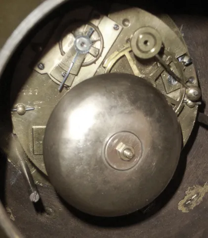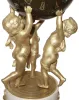 this clock was shipped to us from Europe, and one of the threaded studs from a cherub's hand through the ball has come out, and is taped inside the globe. The movement seems to run and strike OK; we replaced the hand pin so the hands would not get lost, you can fit a better hand washer. Movement access is via a threaded portion of the globe in rear. Note if we ship this a long distance, we will dis-assemble the ball from the cherubs and the cherubs from the base. Ht 20"