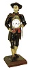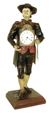 Germany, Black Forest "Uhrentrager" or clock peddler, the figure of polychrome painted sheet iron and in traditional dress, carrying a shield clock at his right fit with a Swiss lever escapement watch movement and dial, and with another clock slung over