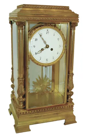 France, extra large "crystal regulator", the dial surrounded by a fancy cast and gilt bezel, the pendulum of sun-burst motif, and the case corners with full Corinthian reeded columns, and all sides with heavy beveled glass, the 5.6" porcelain dial with Arabic numerals and finely pierced hands, c1850 although some of the case gilding is there in the crevices, most of it has been polished to brass, the exception being the bezel which has its original bright gilding. Nice porcelain dial and original gilt hands. The rear beveled glass has substantial chips in 3 of 4 corners, other 3 panes with minor flakes. Overall an exceptional crystal regulator that is worthy of rear glass replacement and re-gilding. Good pendule a Paris movement, Ht 20 1/2"