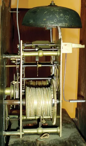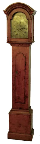 the case has an old finish, nicely rubbed down. There are saw marks on the riser and parts of it have been anchored with nails. This is an appealing clock with good proportions. The weights are replacements. Ht 87"