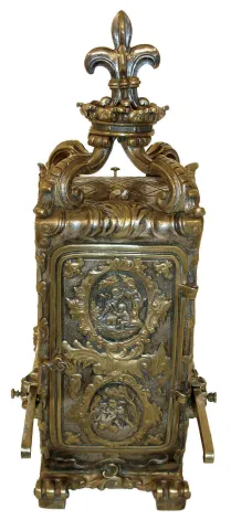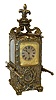 Desk or table clock, French 8 days, time and strike, movement with hour repeating, Roman numeral silvered dial with engraved, gilt mask, blued steel fleur de lis hands, the case with lis glasses and in the form of a sedan chair, the cast case decorated with faux repousse ornament in the rococo style and with fleur de lis finial, and with removable carrying handles, c1890 Case good, with minor wear, dial and mask good, hands with rust, minute replaced, front glass with chip, runs and strikes, repeat function added to time and strike clock, snail mounted to hour wheel, and so will not repeat the correct hour as the next hour approaches, Ht 11"