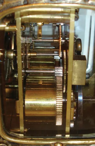 Desk or table clock, French 8 days, time and strike, movement with hour repeating, Roman numeral silvered dial with engraved, gilt mask, blued steel fleur de lis hands, the case with lis glasses and in the form of a sedan chair, the cast case decorated