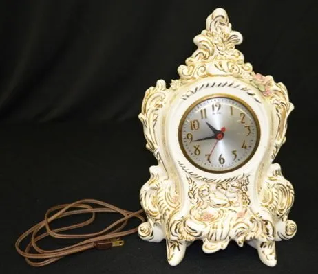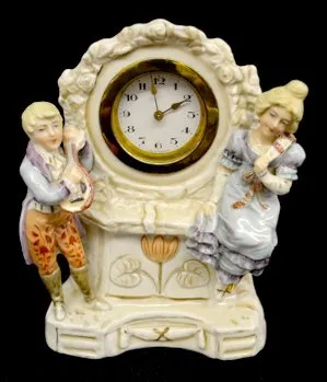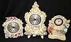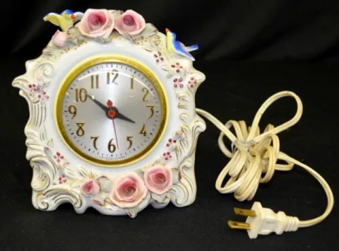 3 Small Ceramic Clocks 1.) German with a courting couple. 2.) Sessions electric. (The top is damaged.) 3.) Sessions - marked "Occupied Japan"; with flowers and birds. (Damaged.) Not tested.