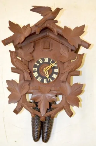 Bird Carved German 8 Day Cuckoo Clock With birds and leaves. 17 1/2" x 13" Not tested.