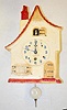 Lux Red Roof House Clock Marked "Lux"; with a gray and tan bird and the pendulum. (There are minor finish issues.) 10 1/2" Tall Not tested.