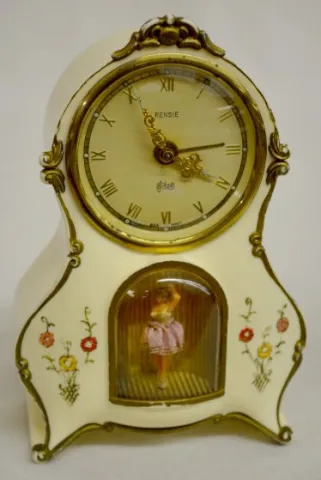1.) German Rensie musical alarm with a twirling ballerina. (The clock runs and the music plays sometimes.) 2.) Swiss Looping Alarm. (The clock is not working at this time.) 3.) Swiss 15 Jewel musical clock. (The clock is not running at this time.) Tallest 10 1/2"