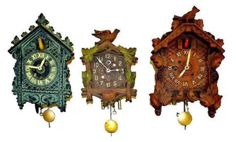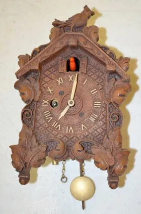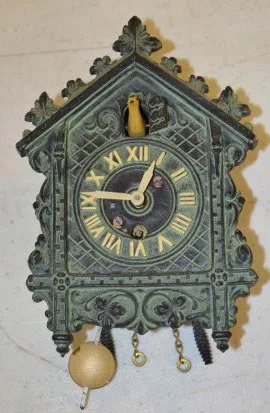 3 Antique Lux & Keebler Pendulette Clocks 1.) Green and black with a bird. (There are some paint chips.) 2.) Keebler Bird and nest. (Has minor roughness.) 3.) Brown bird with a red cuckoo. Largest - 6" Not tested.