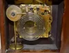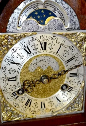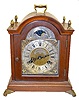 With a T & S movement; moon phases; cherub faces in each corner of the face and in a mahogany with brass trim case. Not tested. 11" Tall x 9" Wide.