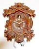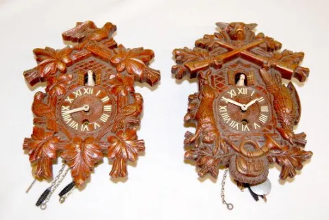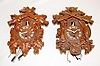 1.) Cuckoo clock carved with deer, guns, game and a white cuckoo. 2.) Cuckoo clock carved with a bird top and a white cuckoo. Largest - 8" x 6" Not tested.