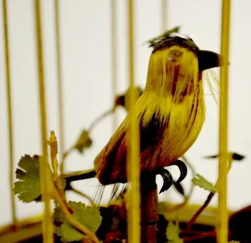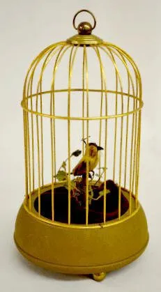 In a brass cage. When wound the bird bobs and turns. (Needs help.) 10" Tall