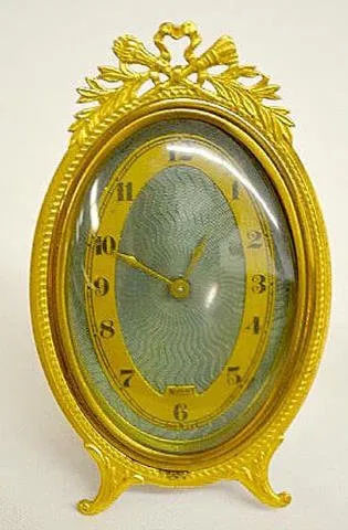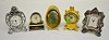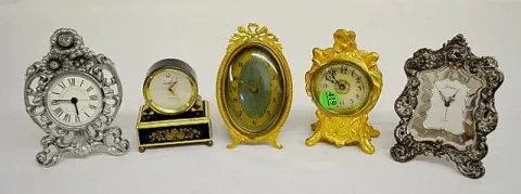 1.) Nuart Brass. 2.) Western floral novelty in a metal case. 3.) Reuge musical alarm. 4.) Metal quartz. 5.) Gorham Cyma Alarm. Not tested. Tallest - 5"