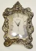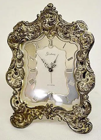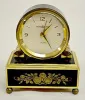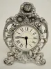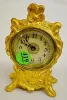 5 Ornate Small Dresser Clocks 1.) Nuart Brass. 2.) Western floral novelty in a metal case. 3.) Reuge musical alarm. 4.) Metal quartz. 5.) Gorham Cyma Alarm. Not tested. Tallest - 5"