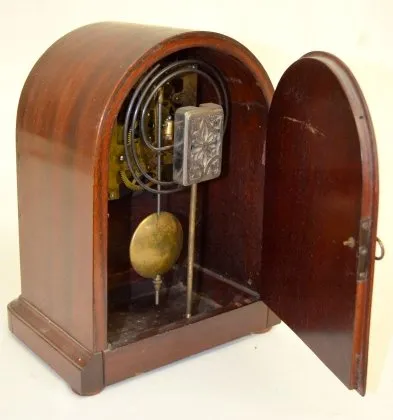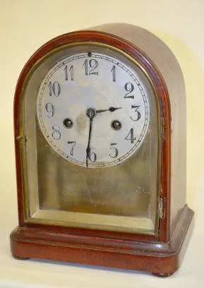 Gustav Becker Mahogany Mantel Clock With a T & S movement signed "GB Silesia"; a metal front and dial. Not tested. (There is minor roughness and scuffs.) 10 3/4" Tall x 8 1/4" Wide