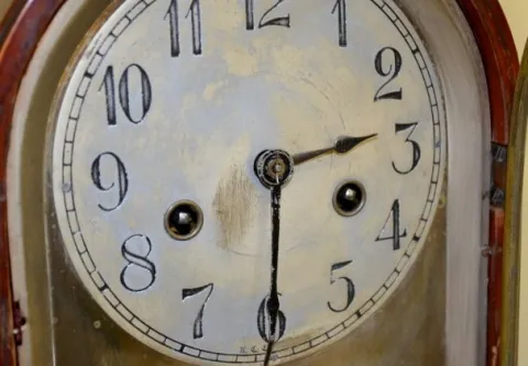 With a T & S movement signed "GB Silesia"; a metal front and dial. Not tested. (There is minor roughness and scuffs.) 10 3/4" Tall x 8 1/4" Wide