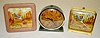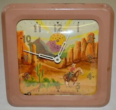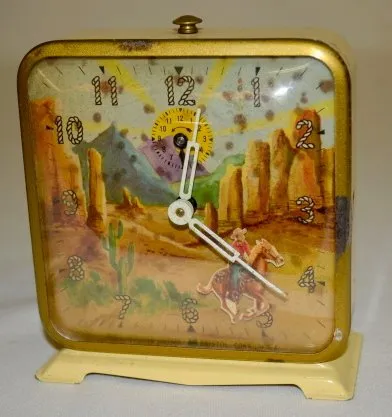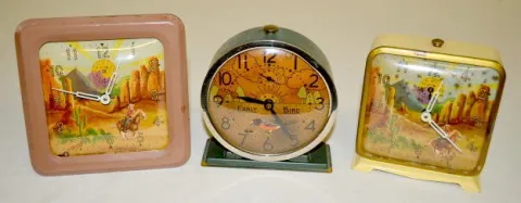 1.) Round, early bird with a worm; in a light blue case. (The dial is darkened. There are minor paint scuffs.) 2.) Ingraham Cowboy; working. (The dial is stained. The case is scuffed.) 3.) Ingraham Cowboy; in a brown frame; runs. (Wound tight but runs.)