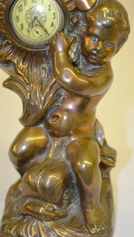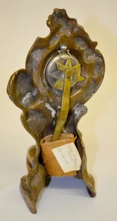 Antique Cherub & Dolphin Pocket Watch Holder With a copper patina. (The back side of the watch brace star is missing 1 or 2 points. The patina is worn.) 10 1/2" Tall