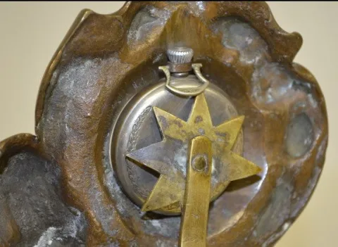 With a copper patina. (The back side of the watch brace star is missing 1 or 2 points. The patina is worn.) 10 1/2" Tall