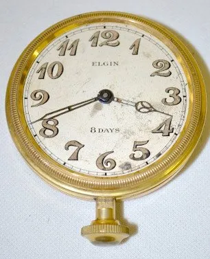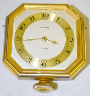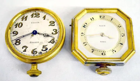 2 Elgin 8 Day Vehicle Clocks, In Running Order 1.) In an octagonal case 2 3/4" x 2 3/4" excluding the winder. It has a gold colored ring dial with black features on a white background. The watch winds and works properly. (We were unable to open the watch. The back of the case has an area of pitting.) 2.) Round with gold and black features; 2 3/4" Wide. The watch winds and works properly. (The dial is dirtied because the crystal is missing.)