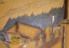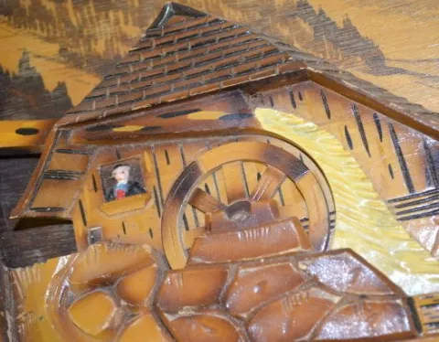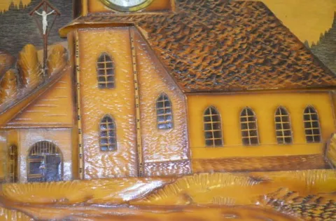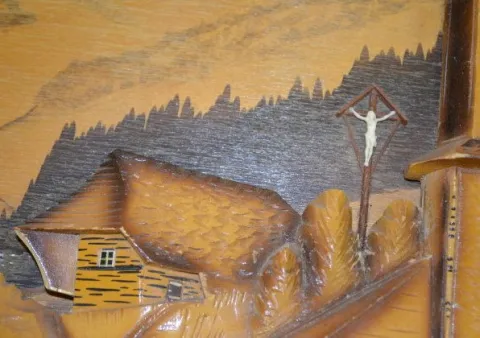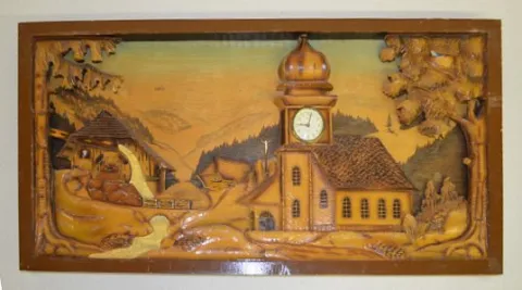 Wood Carved Church Tower Picture Clock With a Kohler 8 day 7 Jewel clock and a 3D religious scene. 15" Tall x 31" Wide Not tested.