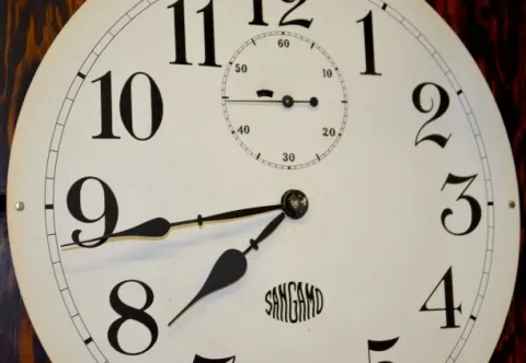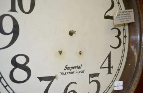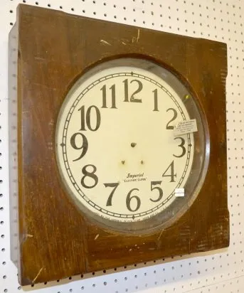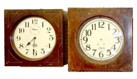 1.) Imperial with a signed dial; 17 1/2" Square. (There are no hands on the dial. The case is rough.) 2.) Sangamo with a marked dial and seconds bit; 16" Square. (The case is rough.) Neither have been tested.