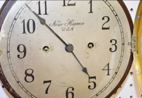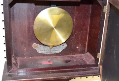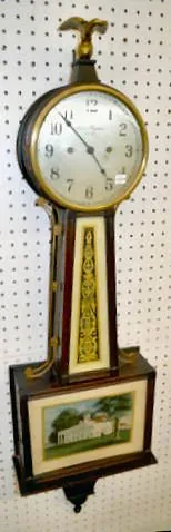 In a mahogany case with a T & S movement, metal dial, an eagle finial and a paper lower tablet. (The dial is worn. The case has minor scuffs.) 44" Tal...