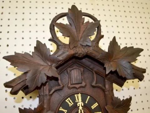 Antique Carved 2 Weight Cuckoo Clock With leaf and branch carvings and 2 weights. 18 1/2" Tall x 13 1/2" Wide Not tested.