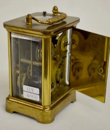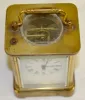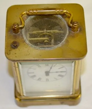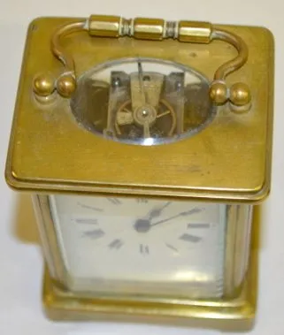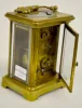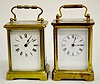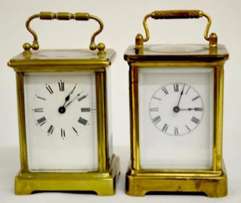 2 Antique French Carriage Clocks, Repeater + 1.) Repeater w/Alarm; in a brass case with a porcelain dial. (There is minor roughness to the brass case.) 2.) In a brass case with a porcelain dial. (The bezel front is chipped. There are minor scuffs to the brass finish.) Neither were tested. Both are approximately 5 1/2" Tall.