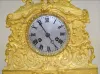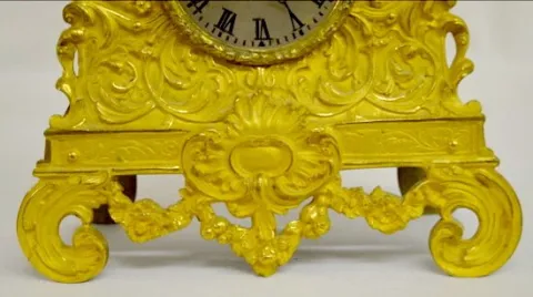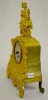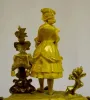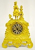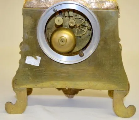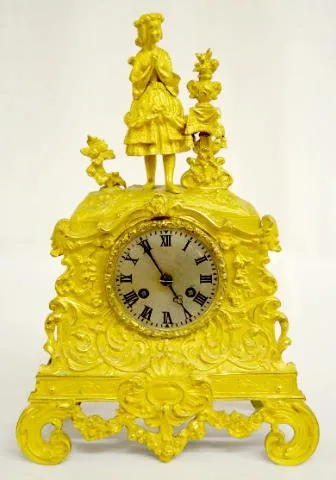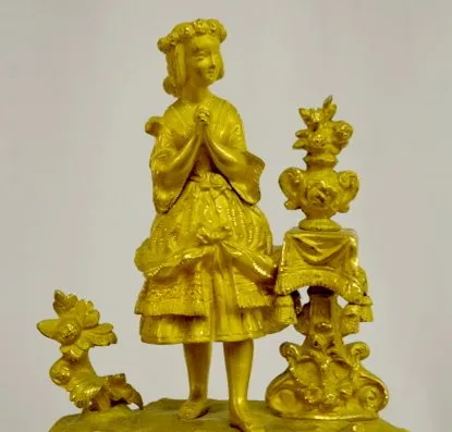 Bell strike with a metal dial; dome case front has floral & scroll designs; girl stands with clasped hands by small table. (The dial is slightly marred; there is no pendulum) 3 1/2" dial; 13 1/4" x 9 1/8" Not tested.