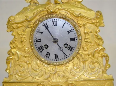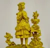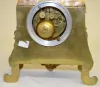 S Marti Silk String Clock With Girl Bell strike with a metal dial; dome case front has floral & scroll designs; girl stands with clasped hands by small table. (The dial is slightly marred; there is no pendulum) 3 1/2" dial; 13 1/4" x 9 1/8" Not tested.