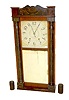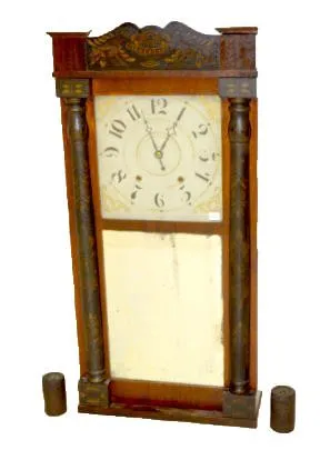 Geo. Mitchell Wood Works Mirror Clock In a stenciled case with bell strike, wood works and 2 weights. (The case has minor roughness and scuffs.) 34" Tall Not tested.