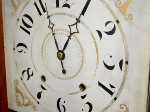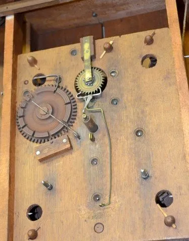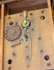 In a stenciled case with bell strike, wood works and 2 weights. (The case has minor roughness and scuffs.) 34" Tall Not tested.