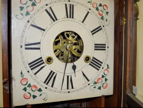 30 Hour, 2 weight with a painted metal dial and a good label. Not tested. 26" Tall