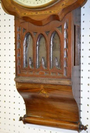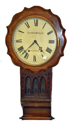 Dilger & Barclay Glasgow Wall Clock In an inlaid scroll bottom case. (The dial surround has been repaired at the 7:30 - 8:00 area. There is roughness to the case. The glass panel is cracked.) 32" Tall; 16 1/2" Wide; Dial - 11 1/2" Not tested.