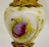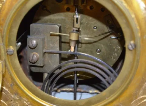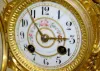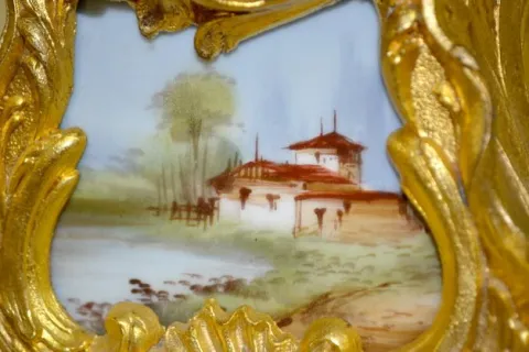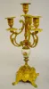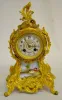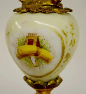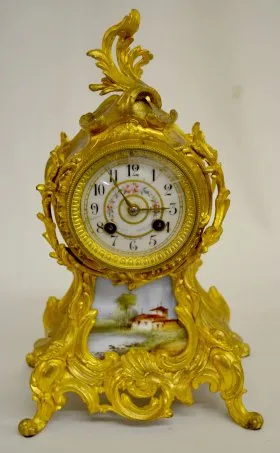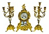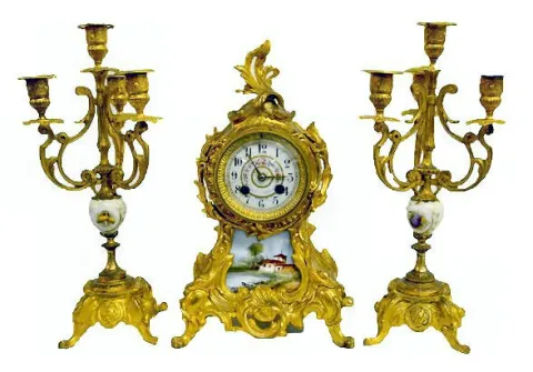 With a T & S movement and a porcelain dial set into an ornate metal frame. The matching 5-cup candelabras also have porcelain inserts on them. Not tested. (The porcelain dial is damaged.) Clock - 13 1/2" Tall x 9" Wide; Candelabras - 14" Tall.