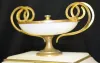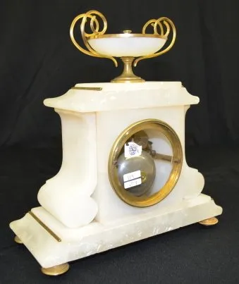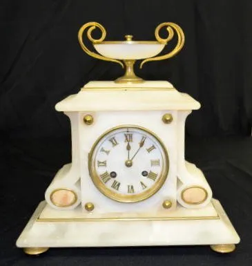 S Marti Alabaster Mantel Clock With a T & S movement, raised numerals on the dial, and brass trim. (There are minor chips to the case.) 11" Tall x 10 1/2" Wide Not tested.