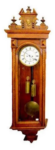 2 Weight Vienna Regulator Wall Clock With brass trim, weights, pendulum and a porcelain dial signed "M Herz or M. Gerz". (The dial has hairlines. The top is not original to the clock.) 52" Tall; 15" Wide; Dial - 6 1/2" Diameter Not tested.