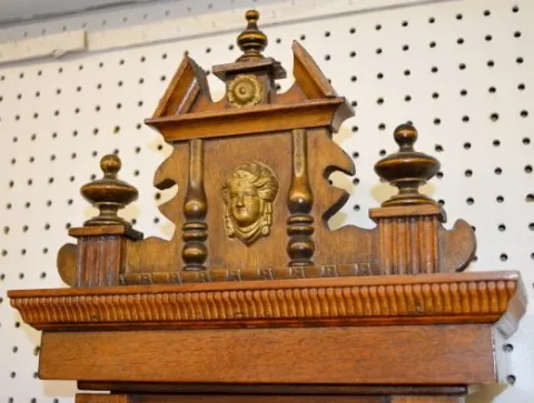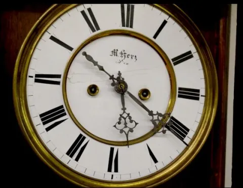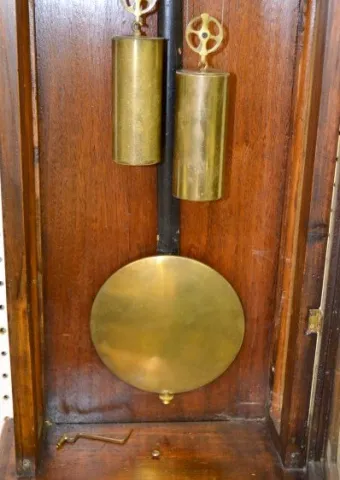 With brass trim, weights, pendulum and a porcelain dial signed "M Herz or M. Gerz". (The dial has hairlines. The top is not original to the clock.) 52" Tall; 15" Wide; Dial - 6 1/2" Diameter Not tested.