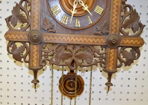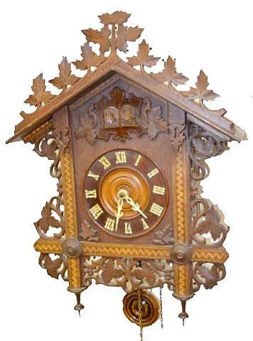 Antique German 3 Weight Cuckoo & Quail Clock In a nice inlaid case with leaf carved decoration. (The pendulum is worn.) 23 1/2" Tall; 17 1/2" Wide Not tested.