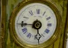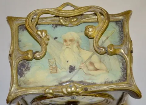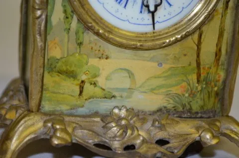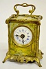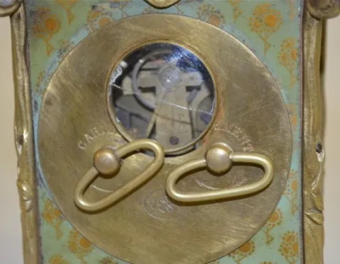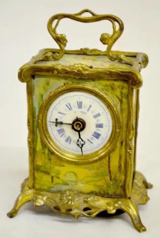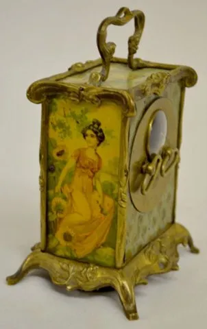 Carriage Clock w/Tin Lithograph Decoration With fixed key winder and alarm bell below the case.The top has Old Man Time; sides are girls; the front and back are scenic and floral. In a brass frame. Enamel dial is 2 1/4"; 5" tall excluding the handle. (Dial has hairline; not running but it winds ok.)