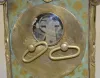 With fixed key winder and alarm bell below the case.The top has Old Man Time; sides are girls; the front and back are scenic and floral. In a brass frame. Enamel dial is 2 1/4"; 5" tall excluding the handle. (Dial has hairline; not running but it winds ok.)