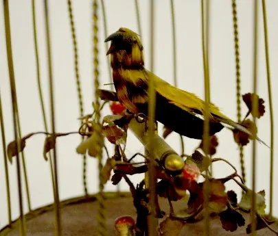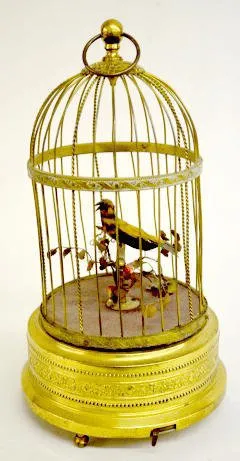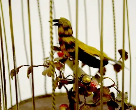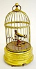 Antique Brass Animated Musical Bird in Cage In a brass frame. When wound, the head turns, the beak and tail move and it whistles. 11 3/4" Tall