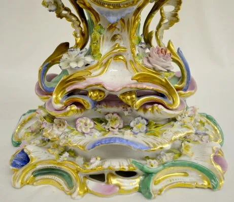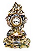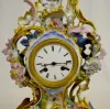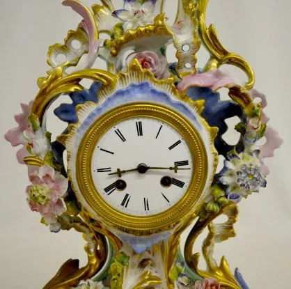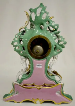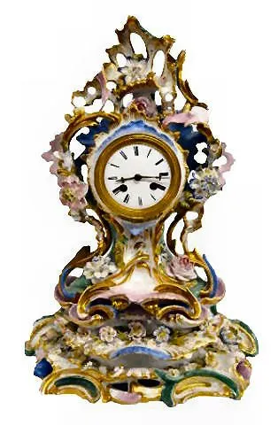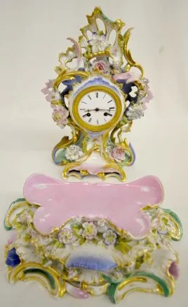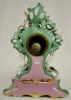 Unmarked with T & S movement and a 3 1/2" porcelain dial. The case and base are reminiscent of Old Paris Porcelain. They are green, pink, blue and gilt with applied flowers. (The springs are wound tight. Some of the flower petals are chipped.) 17 1/8" Tall x 12 1/2" Wide