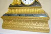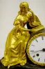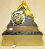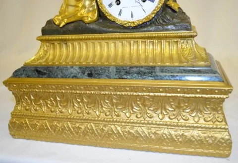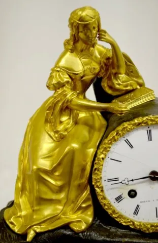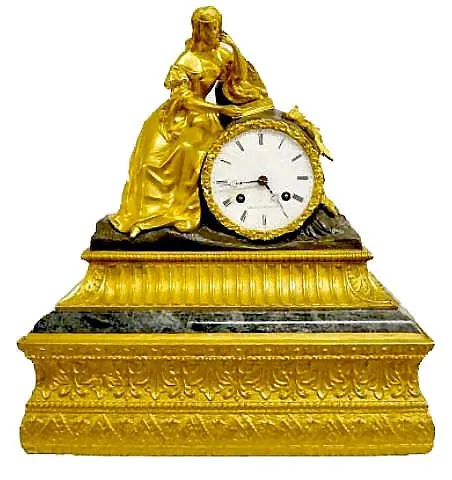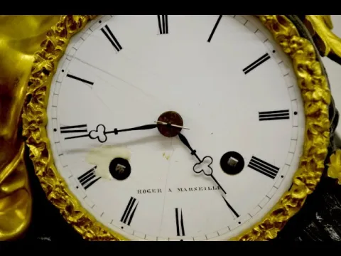 Bell strike movement marked "ETABLISSEMENT". The dial is marked "Roger A Marseille". The Dore' figure by the clock has a book near her. The case is wood, marble, bronze & bronze Dore'. 14" Tall x 12 3/4" Wide (Has the pendulum but string suspension is not properly set.)