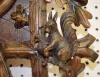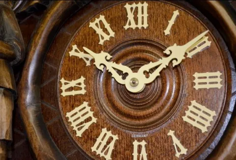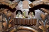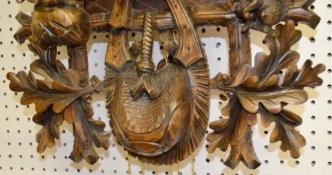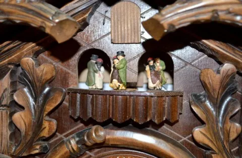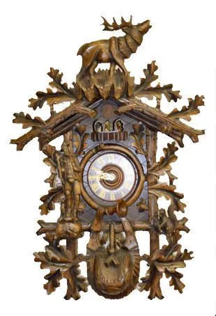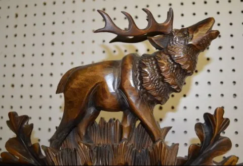 With an elk, a hunting dog and a rabbit; 3 Weights and revolving dancers. It is a big clock and looks nice. 32" Tall (from the bottom of the case to t...