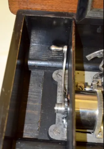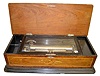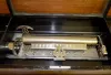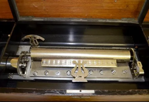 Swiss Cylinder Music Box - 13" Multi-tune With a very clean interior and everything intact with no visible broken pieces. The lid and case front are inlaid with the shapes of flowers and musical instruments. The music box plays and sounds good. (The case top, inside cover and front board have scars and scuffs from use and handling.) 7" Tall x 27 1/4" Wide x 12 1/4" Deep Not tested.