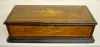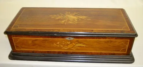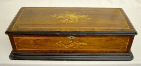 With a very clean interior and everything intact with no visible broken pieces. The lid and case front are inlaid with the shapes of flowers and musical instruments. The music box plays and sounds good. (The case top, inside cover and front board have scars and scuffs from use and handling.) 7" Tall x 27 1/4" Wide x 12 1/4" Deep Not tested.