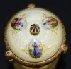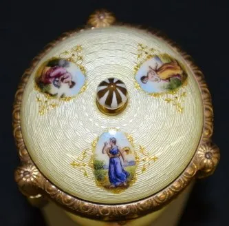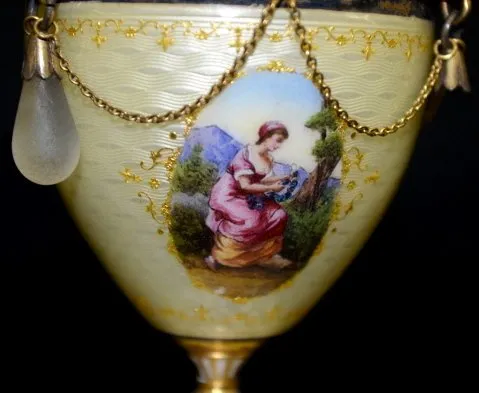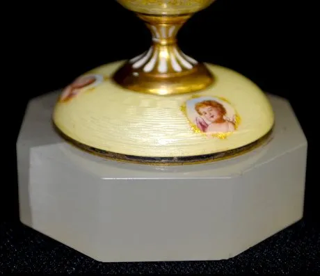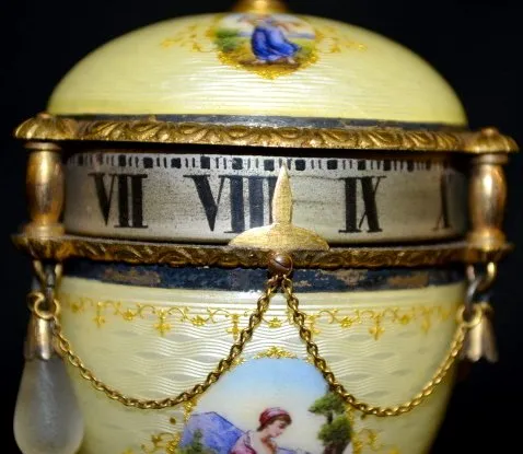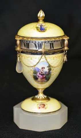 *Listed on Page 3 of "The Foreign Clock Book". With polychrome enamel portraits of a woman and putti. The chapter ring is silvered. (It is missing a glass teardrop prism.) 4 1/2" Tall Not tested.